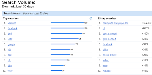 Google har frigivet værktøjet Google Insights for Search, et redskab, som gør det let at finde ud af, hvad netbrugere jorden rundt søger efter på Google netop nu. Top 10 for Danmark de sidste 30 dage ser sådan ud: